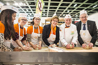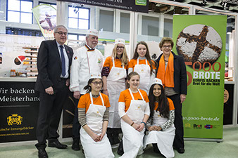Vom Kinder- und Jugendbildungsreferenten der Region Charles Sebastian Böhm begleitet, stellten sich die Konfirmanden den Fragen der anwesenden Journalisten. Gemeinsam mit Cornelia Füllkrug-Weitzel, Präsidentin von Brot für die Welt und Michael Wippler, Präsident des Zentralverbandes des Deutschen Bäckerhandwerks e.V. buken sie in der gläsernen Backstube des Bäckerhandwerks Brot. Sie gaben so den symbolischen Startschuss für eine Aktion, die 2016 mit vielen lokalen Bäckern und Konfirmanden vor Ort wiederholt werden soll: Konfirmanden und Bäcker backen gemeinsam Brote, die gegen eine Spende angeboten werden.
